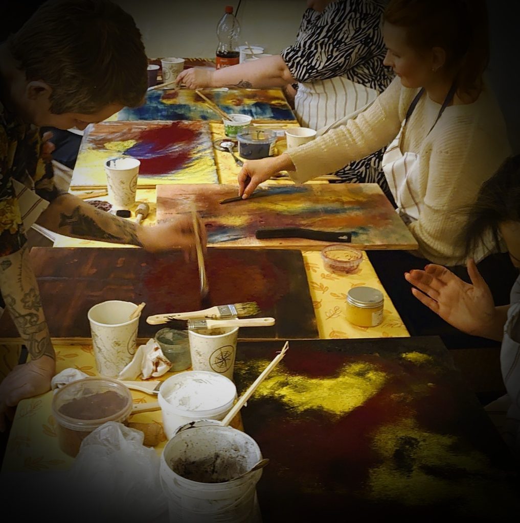 Toimintaan sopii 1-12 henkilöä, Hinta: 400 € – 850 € + Alv vaikuttavista asioista riippuen. Maalaamisen luova polku sopii työnohjaukseen, virkistykseen ja omaehtoiseen toimintaan.