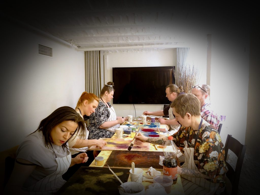 Toimintaan sopii 12 henkilöä, Hinta: 250 € – 400 € + Alv vaikuttavista asioista riippuen. Toiminnan hinta yhdelle henkilölle on alkaen 80€ + Alv. Maalaamisen luova polku sopii työnohjaukseen, virkistykseen ja omaehtoiseen toimintaan.